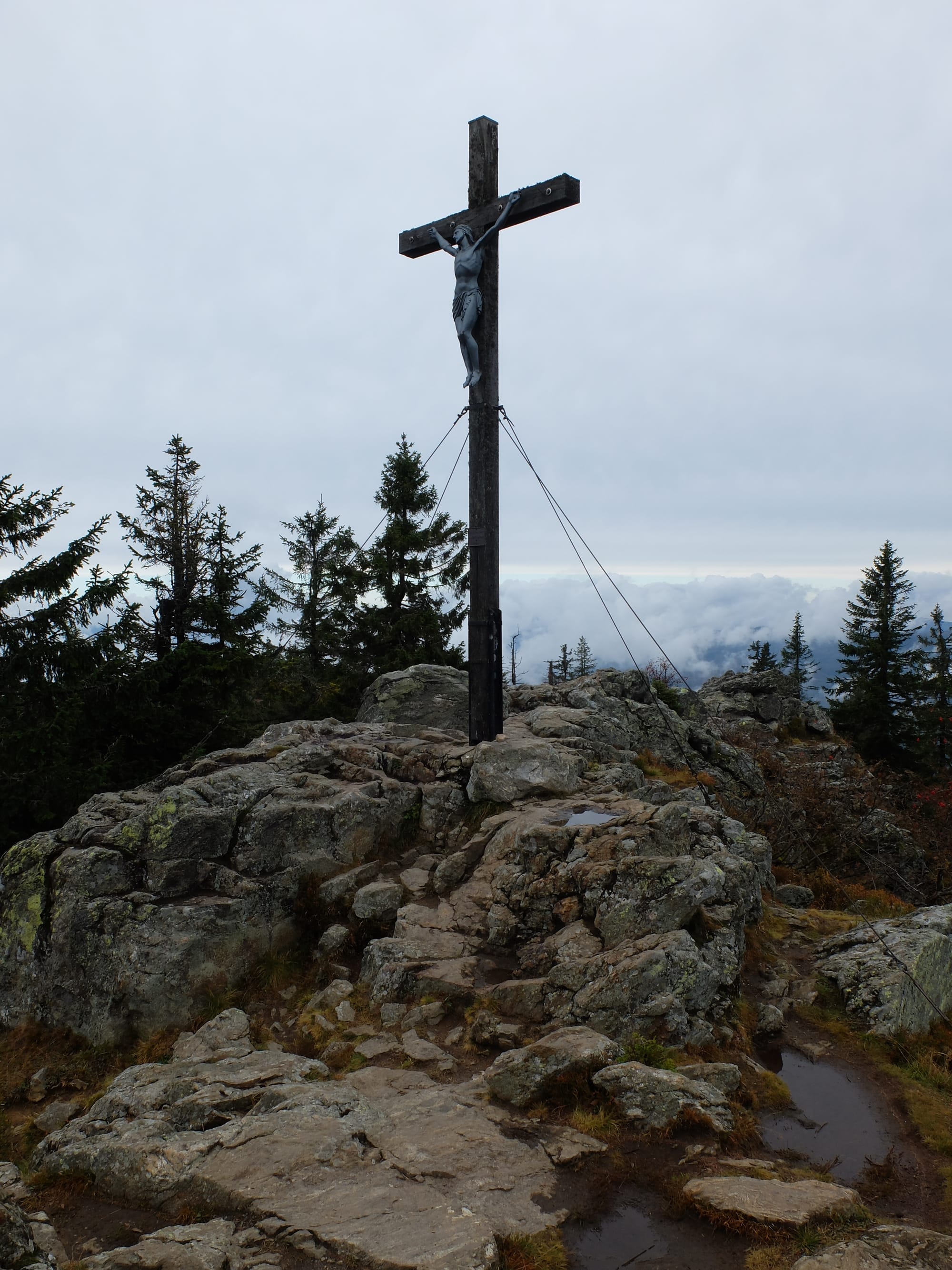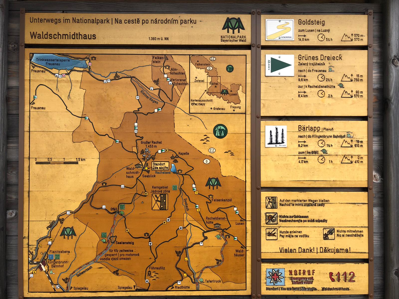 Ab dem Waldschmidthaus führt ein steiniger Bergpfad weiter zum Gipfel: In wenigen, aber knackigen Höhenmetern geht es über Wurzeln und Felsstufen hinauf zum Gipfelkreuz mit weitem Panorama über Nationalpark, Arberland und bei Föhn bis in die Alpen. Für die komplette Runde Gfäll – Waldschmidthaus – Großer Rachel – Rachelkapelle – Rachelsee – Gfäll sollte man eine gute Tages- bzw. ausgedehnte Halbtagestour einplanen.tourentipp+3