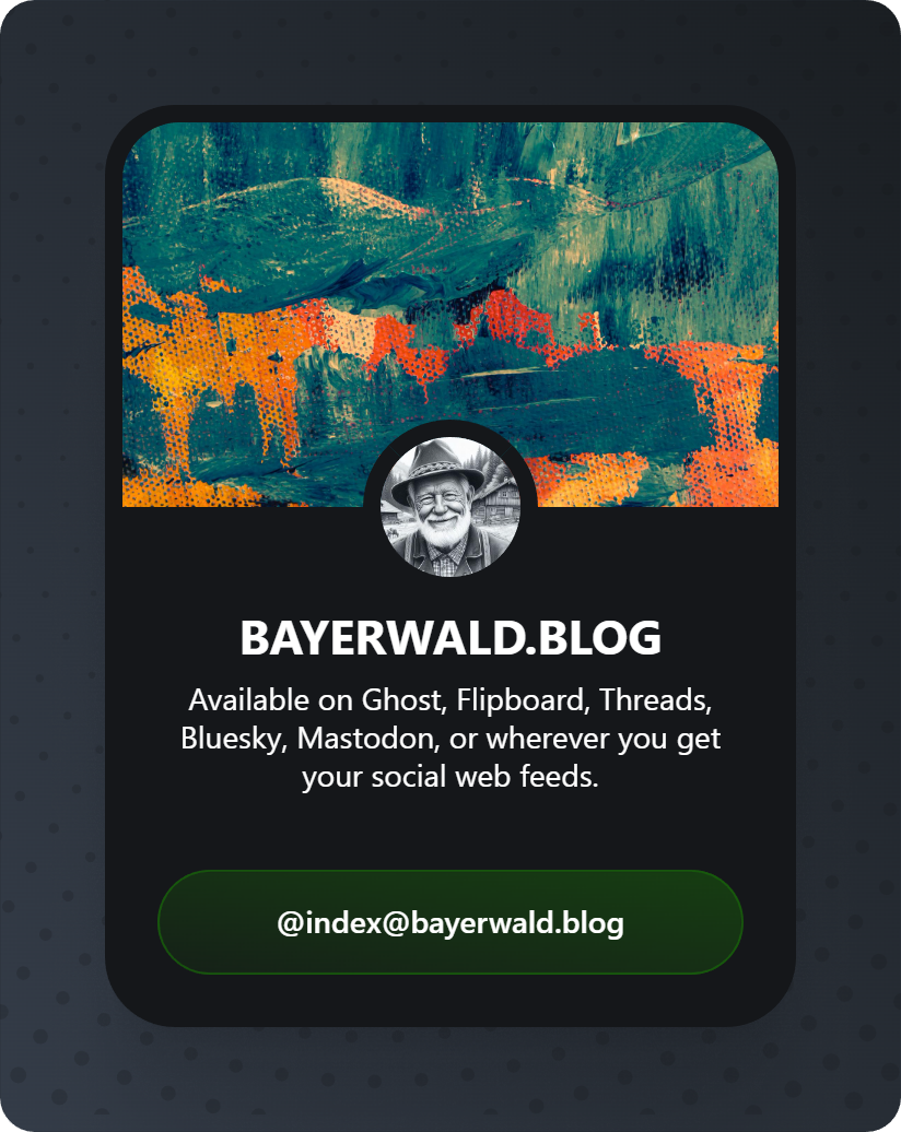 - bayerwald.social (Mastodon): Followt @index@bayerwald.blog – jeder Post landet in der Timeline.